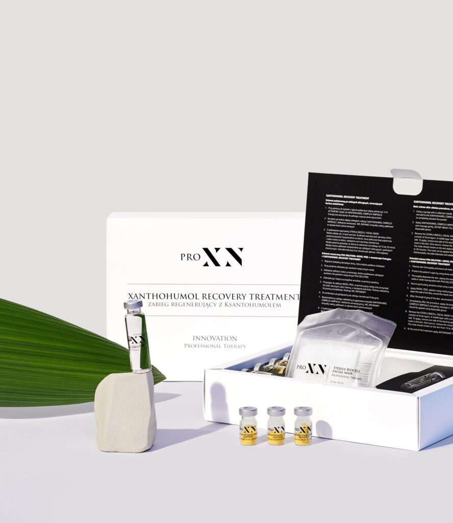 Autorski zabieg PRO XN — I stopnia to zaawansowana terapia wykorzystująca działanie ksantohumolu, kwasu azelainowego i glukonolatonu. Kwas azalainowy wykazuje działanie przeciwbakteryjne i rozjaśniające, dzięki czemu łagodzi objawy trądziku pospolitego i różowatego oraz wyrównuje koloryt skóry. Glukonolaton aktywuje syntezę niezbędnych lipidów (ceramidów i fosfolipidów), zapewniając ochronę skóry oraz przenosi cząsteczki wody w głąb skóry, przyczyniając się do utrzymania jej odpowiedniej wilgoci.